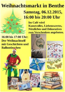 Am Nikolaustag (06.12.25) findet zum ersten Mal in Benthe ein Weihnachtsmarkt vor dem Cafe benthe.mitte auf dem Steinweg statt, an dem sich viele Vereine und Institutionen des Dorfes beteiligen werden. Es gibt zu Essen und zu Trinken und vieles mehr.